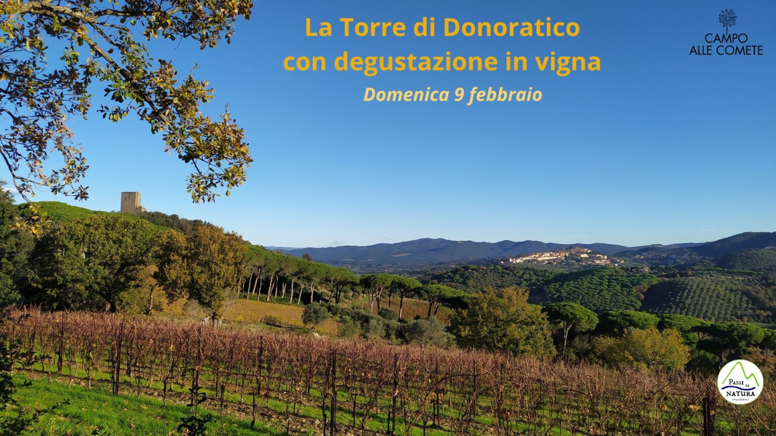 L’escursione è un mix perfetto di natura, storia, paesaggi e… vino. Castagneto Carducci e la Torre di Donoratico si trovano infatti in una delle zone vinicole più importanti e rinomate della Toscana. L’itinerario è realizzato in collaborazione con l’azienda vinicola Campo alle Comete, offrendo un’appagante degustazione di vini in vigna, proprio di fronte alla Torre di Donoratico e a un panorama mozzafiato.