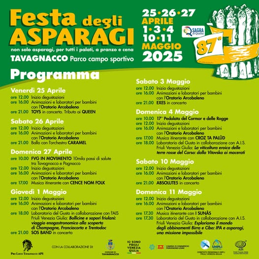 La Festa degli Asparagi è un evento enogastronomico di grande rilievo che si svolge ogni anno nel comune di Tavagnacco, in provincia di Udine, solitamente tra la fine di aprile e l’inizio di maggio. Questa festa celebra l’asparago bianco, un’eccellenza tipica della zona, e attira numerosi visitatori grazie alla sua atmosfera conviviale e alle prelibatezze culinarie.