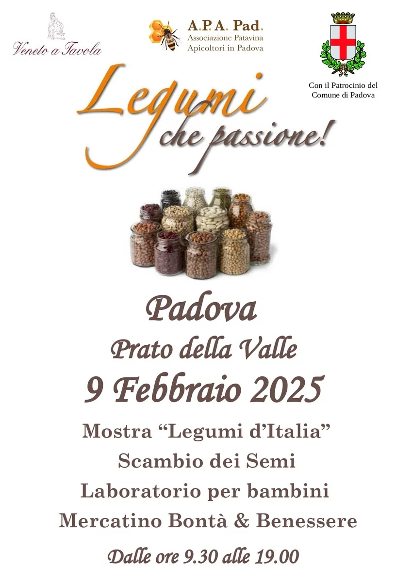 Domenica 9 febbraio 2025, nel suggestivo scenario di Prato della Valle a Padova, avrà luogo la manifestazione LEGUMI CHE PASSIONE, organizzata da Veneto a Tavola, dall’Associazione Patavina Apicoltori in Padova e promossa dal Comune di Padova.